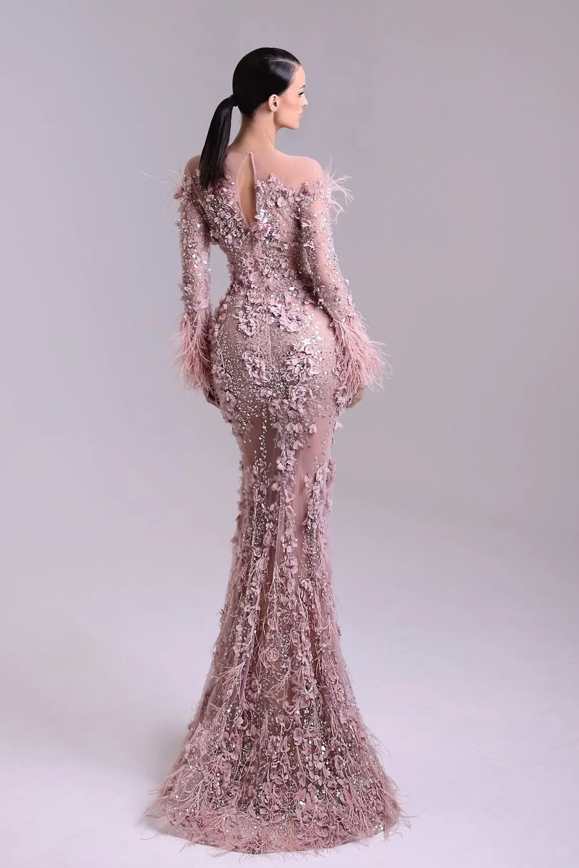 Crafted from delicate tulle adorned with intricate feathers and 3D flowers, this dress features a luxuriously soft lining for effortless comfort. Designed to make a statement, it is the ultimate choice for prom nights, elegant evening soirees, wedding celebrations, and every special occasion in between. Step into it, and let your radiance take center stage at any event.