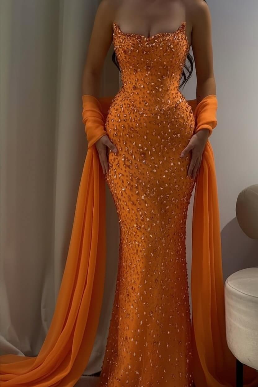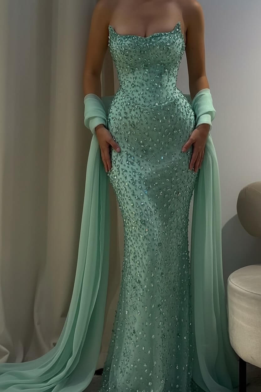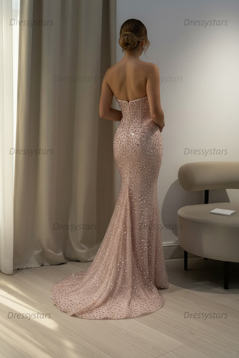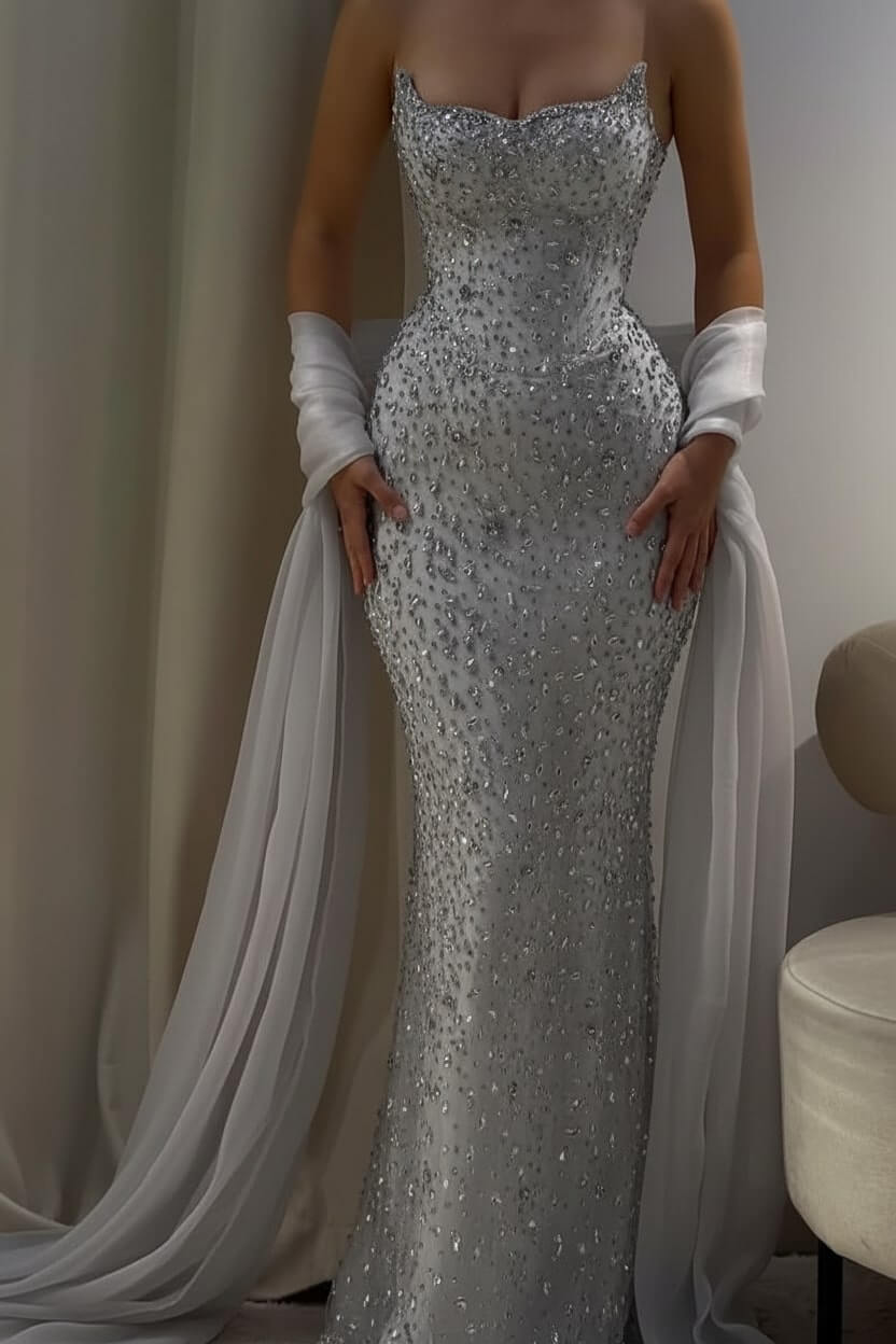 Complete your look with delicate crystal earrings, strappy heels, and a sleek clutch. Let the gown's stunning beadwork be your statement piece for an effortlessly glamorous ensemble.