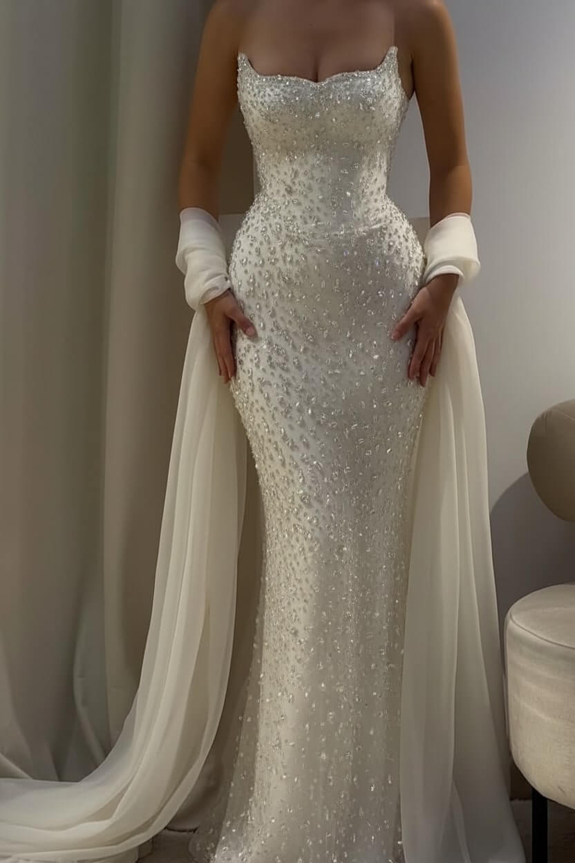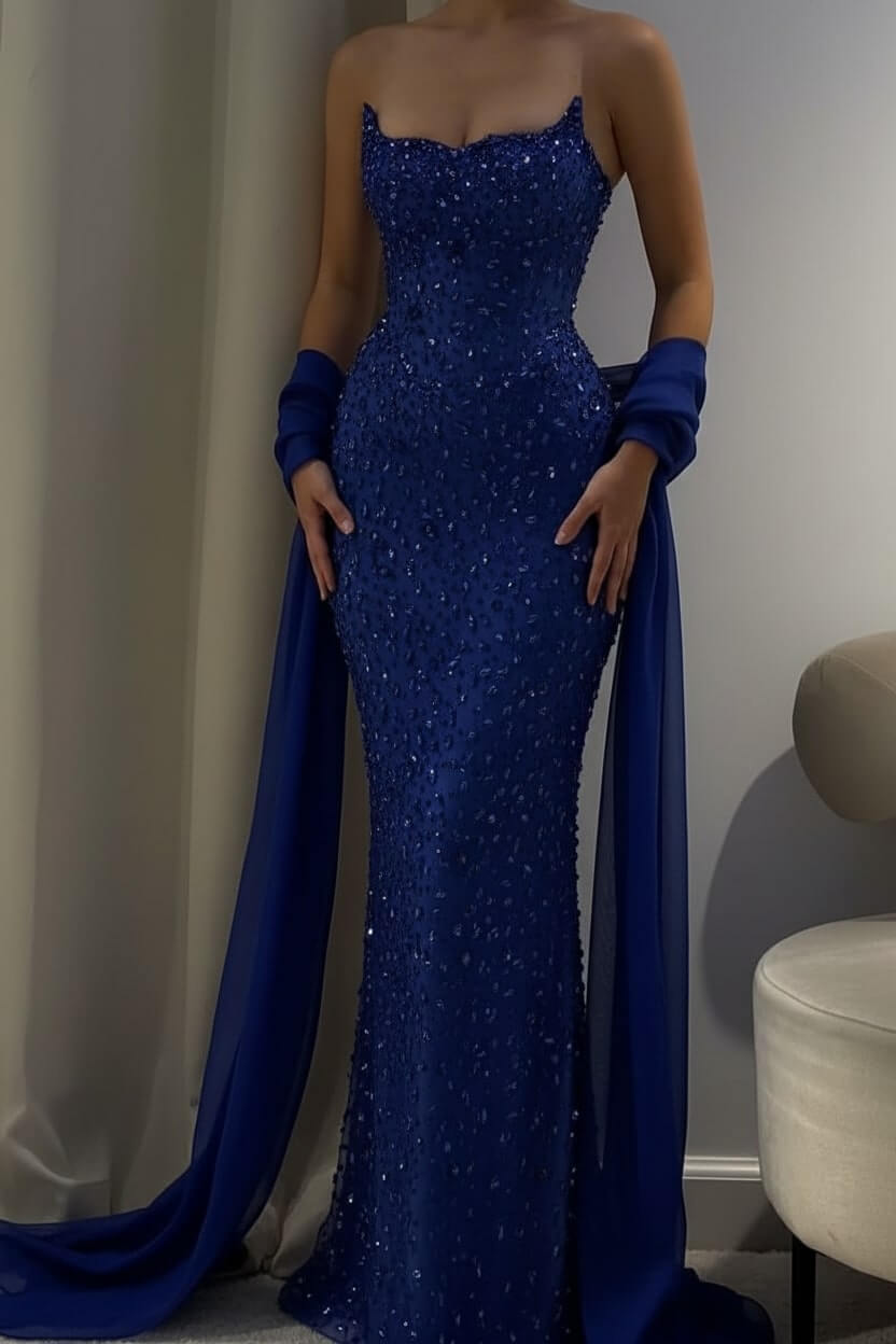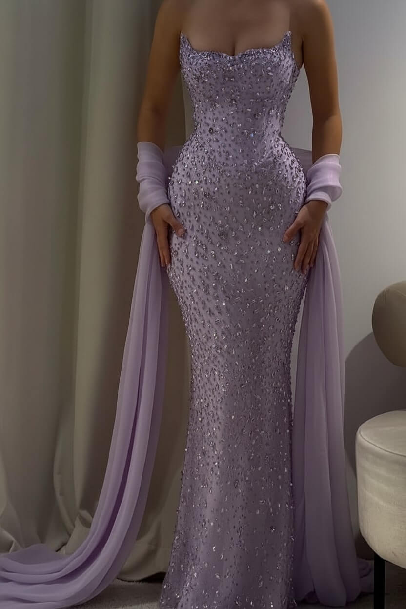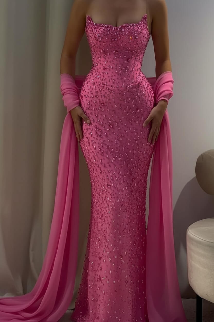 Complete your look with delicate crystal earrings, strappy heels, and a sleek clutch. Let the gown's stunning beadwork be your statement piece for an effortlessly glamorous ensemble.