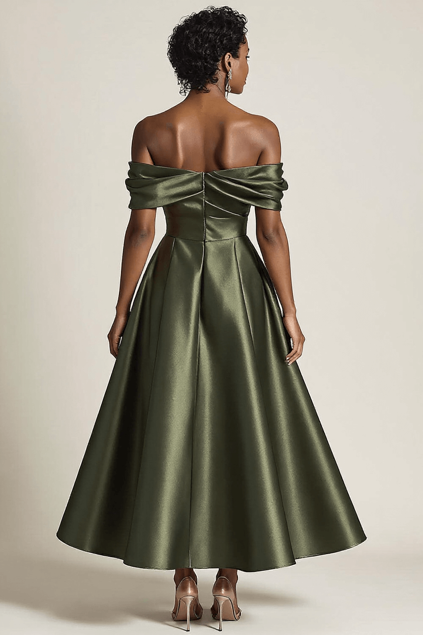 Satin Olive Wedding Guest Dress A-Line Off The Shoulder Ruched Ankle Length Formal Dress